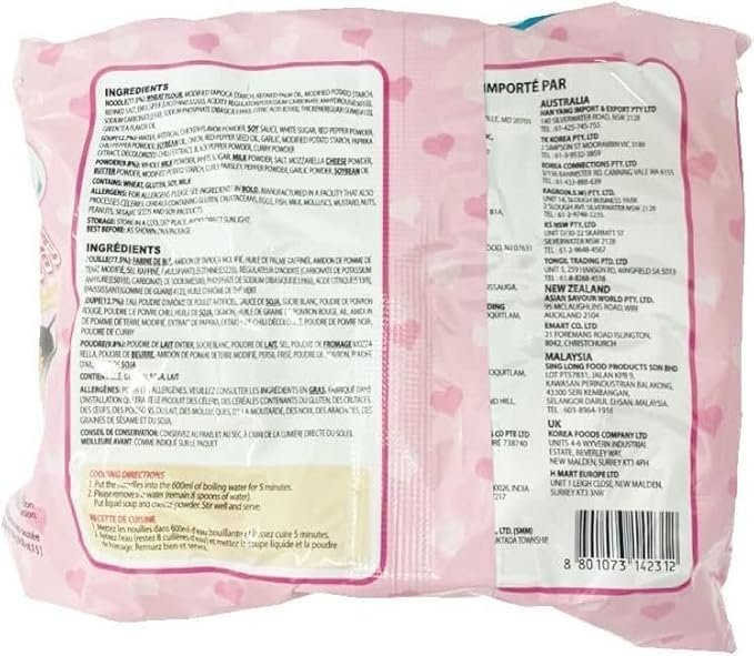 Noodle (77.5%): Wheat Flour, Modified Tapioca Starch, Refined Palm Oil, Modified Potato Starch, Wheat Gluten, Refined Salt, Emulsifier [Lecithine [E322(ii)], Onion Extract, Acidity Regulator (Potassium Carbonate Anhydrous (E501(i)), Sodium Carbonate (E500), Sodium Phosphate Dibasic [E339(ii)], Citric Acid (E330)], Thickener [Guar Gum (E412)], Green Tea Flavour Oil. Soup (12.7%): Water, Artificial Chicken Flavour Powder, Soy Sauce, White Sugar, Red Pepper Powder, Chilli Pepper Powder, Soybean Oil, Onion, Red Pepper Seed Oil, Garlic, Modified Potato Starch, Paprika Extract, Decolourised Chilli Extract, Black Pepper Powder, Curry Powder. Powder (9.8%): Whole Milk Powder, Milk Powder, White Sugar, Salt, Mozzarella Cheese Powder, Butter Powder, Modified Potato Starch, Curly Parsley, Pepper Powder, Garlic Powder, Soybean Oil